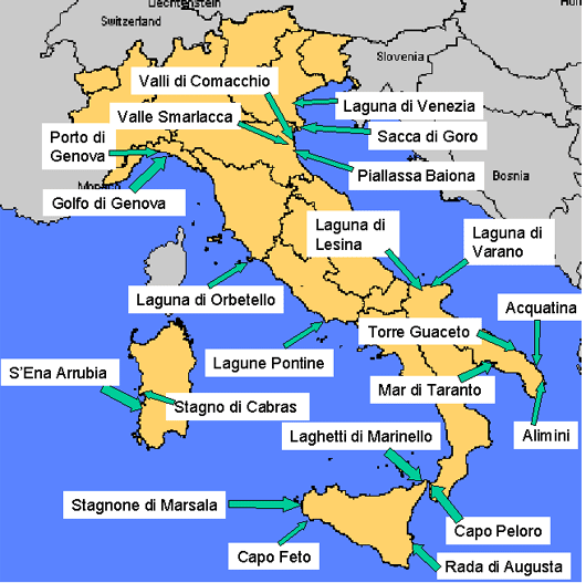 Laguna di Venezia Sacca di Goro Valli di Comacchio Valle Smarlacca Piallassa Baiona Porto di Genova Golfo di Genova Laguna di Lesina Laguna di Varano Laguna di Orbetello Lagune Pontine Torre Guaceto Acquatina Alimini Mar di Taranto Capo Peloro Laghetti di Marinello Stagno di Cabras S Ena Arrubia Rada di Augusta Stagno di Marsala Capo Feto